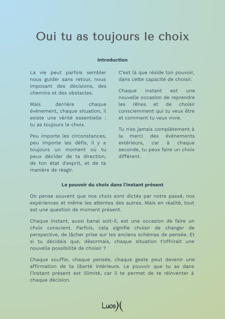 Mais derrière chaque événement, chaque situation, il existe une vérité essentielle : tu as toujours le choix.